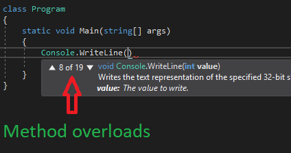 The following image shows the 8th overload of the method WriteLine(), for writing an integer number on the console. The method WriteLine() has 19 overloads.