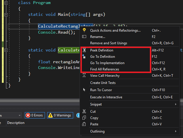 - Go To Definition will make Visual Studio to immediately jump to the declaration of that method and function. Useful if we want to study in detail the declaration and the body content of a method or function.