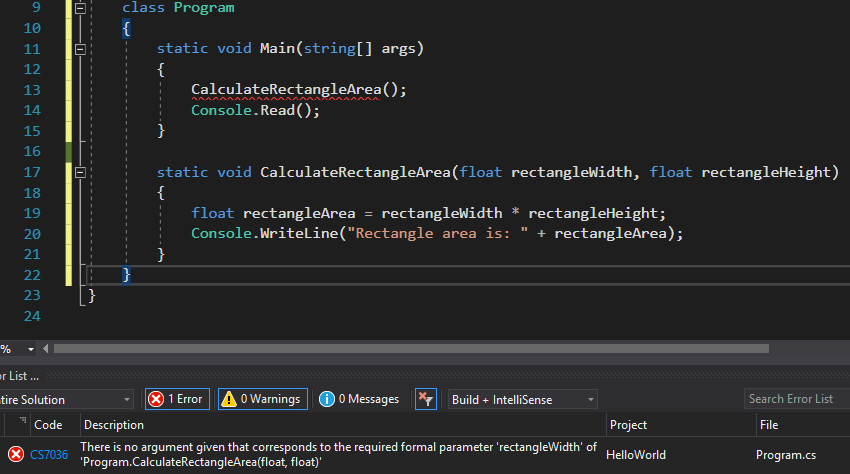 Because in our Main() method we called CalculateRectangleArea() without specifying two float values between the parenthesis, and because we declared our CalculateRectangleArea() method as having two mandatory float parameters, Visual Studio will display the following error: