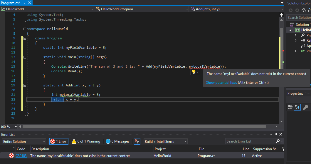 Now, let’s change the above code a bit. Move the declaration of myLocalVariable from inside the body of our Add() function to the body of our Main() method: