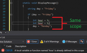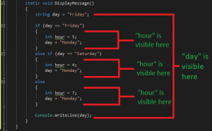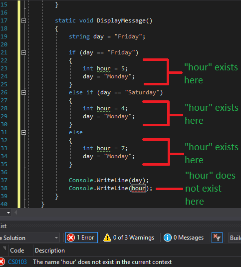 The explanation is simple: local variables can be even more “local”. Just like our day variable is a local variable because we declared it inside the body of our DisplayMessage() method, and it’s only visible inside the body of that method, our hour variables, because we declared them inside the bodies of the if-else structure, they are only visible in the blocks of those if-else parts where they were declared. Examine the following image: