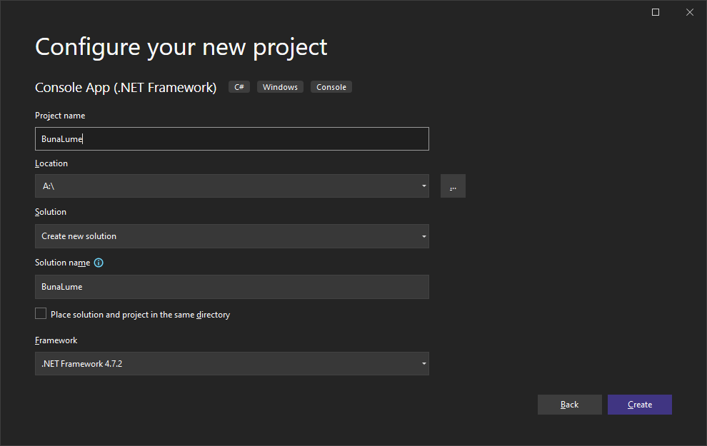 Puteți specifica acum alt nume pentru noul proiect, în loc de ConsoleApplication1 care este implicit, și, dacă doriți, puteți seta o nouă locație ca și cale unde vor fi create fișierele de proiect. În tradiția a aproape oricărui prim proiect-lecție, voi schimba numele proiectului meu în BunaLume. După ce ați terminat, faceți clic pe Create.