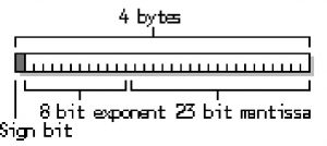 The C# language keeps the value on a mantissa of 23 bits (which contains the fractional part) and an exponent of 8 bits (which contains the power with which the number is multiplied) and a single bit of sign (which tells the compiler if the value is positive or negative). In other words, if a variable contains the value 3.4E+38, the sign bit will be 0, which indicates a positive number, the 23 bits mantissa will contain a binary representation of number 3.4, and the 8 bit exponent will contain a binary representation of 1038