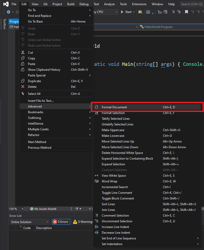 Visual Studio deals with formatting your code by default. However, there are cases when this auto-formatting will fail. In that case, go to Edit menu, chose Advanced and click Format Document