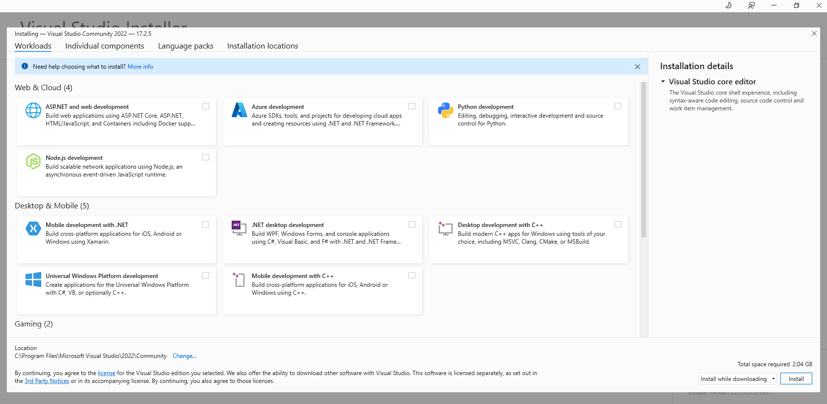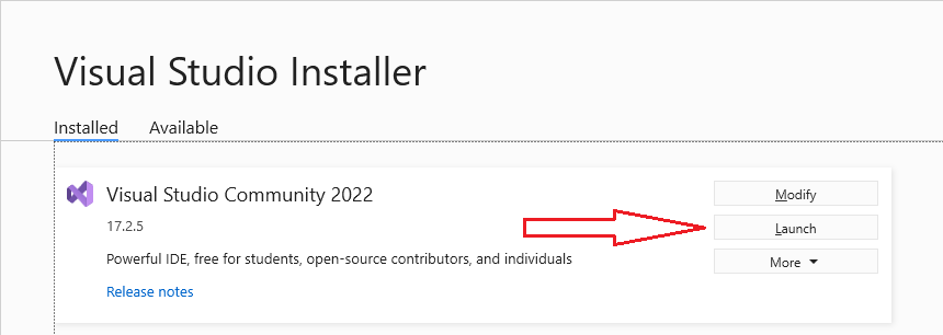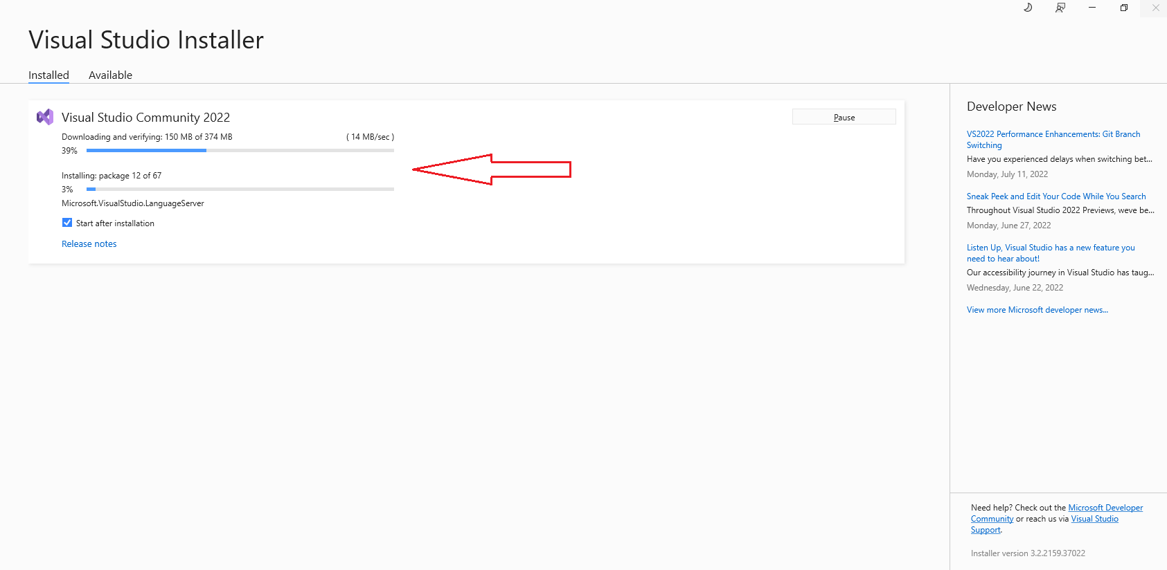 Be patient. That operation can take a while. When it is done, you will be presented with the main installation screen of Visual Studio Community Edition 2022: