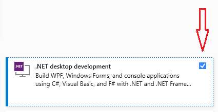 For the purpose of these lessons, you are only interested to install “.NET desktop development”. Select it by clicking on the check mark: