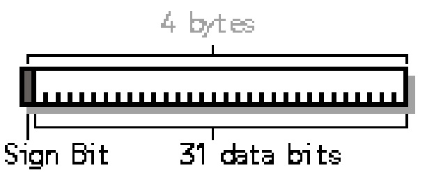 A variable is a name that the compiler assigns to one or more memory location(s). When you declare a variable in a program, you have to specify its type and name. The type of a variable specifies the kind of values that the variable can store and the set of operations that the program can execute on variables. For the int variable type, the C# compiler usually allocates 32 bits (4 bytes). The int variable type can store values from -2,147,483,648 to 2,147,483,647. The following image illustrates how an int variable type is represented in C#: