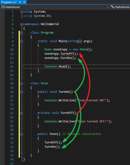 The TurnOff() method, being declared private, is accessible inside the class where it was declared, so, calling it inside the Oven constructor works fine. However, trying to call it from the Program class is forbidden. On the other side, method TurnOn(), being declared public is accessible to both the class where it was declared, and to the Program class.