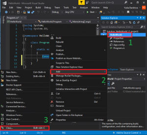 In the Solution Explorer window, right click on your project name (the project, not the solution!), and chose from the menu “Add” the submenu “Class…”, like in the following image: