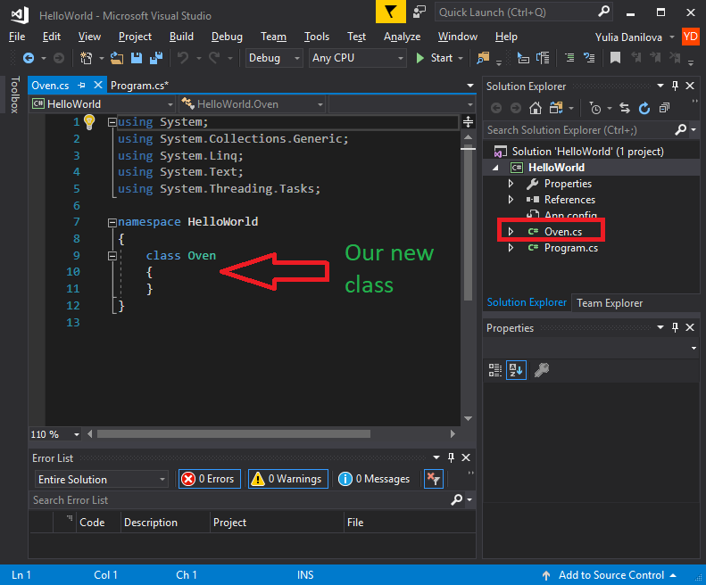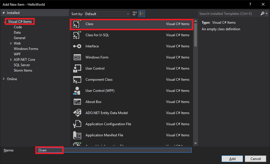 Make sure you have selected “Visual C# Items” on the left list, and “Class” template selected in the list. Name your new class “Oven”. Click Add button. You should now have a new file that looks like this: