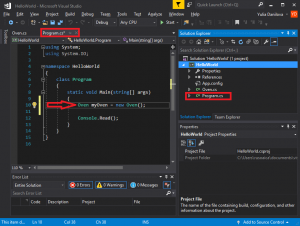 Since we created our first class example using a separated file for it, I need to specify that in order to declare and use our class object, we need a different place to do that, not do it inside that class itself. Instead, we are declaring and initializing it inside the Main() method of our program. This is how our class file should look like: